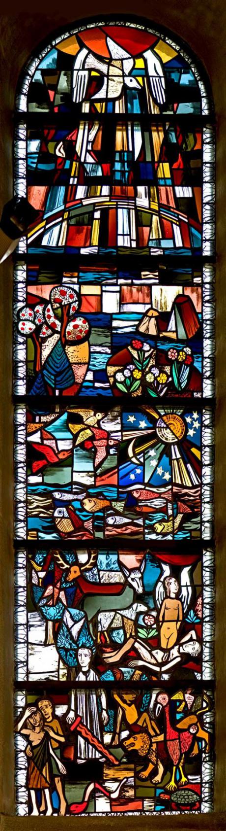 Diese drei Fenster sind im Jahr 1940 und 1941 entstanden, wurden aber erst nach dem Krieg eingebaut. Sie gehören zu den letzten Arbeiten von Walter Kohler.