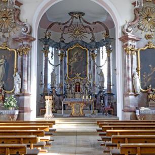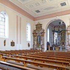 Und so erhielt der gesamte Kirchenraum im Zuge dieser Maßnahmen eine dezente „Stuckierung mit leicht differenzierter Farbtönung“. Anstelle eines Deckengemäldes schuf die Fa. Kaiser aus Iggingen die heute noch zu sehende „einfache Ornamentik in leichten Architekturlinien“.