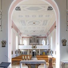 Das mit Stuck überformte umlaufende Fries am oberen Ende der Lisenen bildet im gesamten Kirchenraum (Langhaus und Chor) durch die dort beginnende Kehlung einen eleganten und weichen Übergang von den Seitenwänden zur stuckierten Decke. Dabei wurde allerdings nur die Decke im Kirchenschiff in querliegende Felder unterteilt, nicht jedoch die Decke im Chor