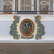 Das Ovalbild an der Emporenbrüstung ist im frühen 18. Jahrhundert entstanden, kopiert eine Komposition um 1520. Der Gekreuzigte mit Hll. Maria und Johannes.