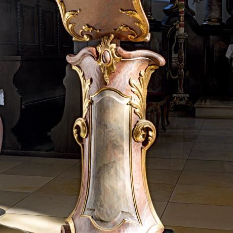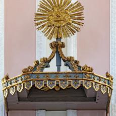 Wann genau die Kanzel geschaffen wurde ist nicht bekannt. Es ist jedoch davon auszugehen, dass sie wohl zunächst am Chorbogen der al ten Kirche angebracht war. Sie wurde 1784 etwas modifiziert und hat seither ihren Platz im Langhaus der Kirche rechts vor dem Herz Jesu– Altar. Die heutige Verkleidung des Treppenaufgangs wurde 1956 stilgerecht angepasst.