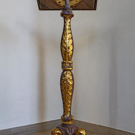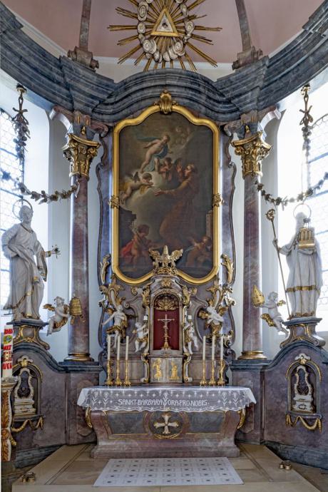1784 geweiht der Hl. Barbara, (in der Oeffinger Klosterkirche 1778 ursprünglich dem Hl. Antonius von Padua geweiht) entspricht einer offenen Baldachinarchitektur mit vier Säulen.