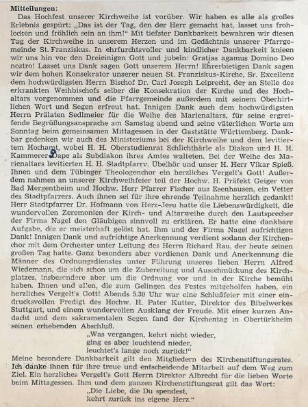 Am Palmfreitag, den 30. März 1957 um 17 Uhr die Weihe der neuen Orgel durch den S.S. Dekan Montsignore Vogel. Vorführung der Orgel durch S. S. Studienrat Dr. Böhringer. … Die Weihefeier gestaltete sich eindrucksvoll. Die Mitwirkenden haben ihr bestes. Die neue Orgel kostet 46238,60 DM.
