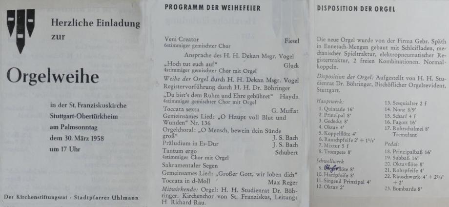 Am 7. Januar 1957 hat das Bischöfliche Ordinariat die Anschaffung einer neuen Orgel für unsere St. Franziskuskirche genehmigt. Am gleichen Tage beschließt der Kirchenstiftungsrat die Anschaffung der neuen Orgel nach dem Vorschlag des bischöflichen Orgelbaumeisters Studiendirektor Löffler u. dem Stuttgarter Orgelintendanten H. Böhringer mit mechanischer Schleiflade um den Preis von 41000.- DM. hierzu 1/3 bei der Auftragserteilung, die am 21. Januar 1957 erfolgte, 1/3 bei der Lieferung der Orgel u. 1/3 Rest in monatlichen Raten nach Möglichkeit. Lieferungstermin ist 29. Sept. 1957, 8 Tage vor dem Kirchenpatrozinium.