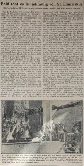 Am Mittwoch, den 2. Sept. 1959 wurden in der Glockengießerei Fa. A. Bachert in Heilbronn die 5 neuen Glocken für unsere Franziskuskirche gegossen. … Am Freitag, den 20. September 1959 weihte der Hochwürdigste Herr Domkapitalur Dr. Hubertus Wurm, Rottenburg, die 5 neuen Glocken der St. Franziskuskirche.