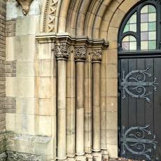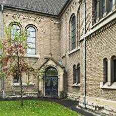 Der Stil der Außenfassade ist dem Historismus verpflichtet. Er lässt sich sowohl romanisch als auch gotisch charakterisieren. Bei Fenster- und Türöffnungen wie auch den umlaufenden Blendbogenfriesen findet als romanisches Element eine durchgehende Anwendung des Rundbogenfrieses statt.