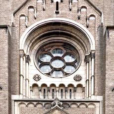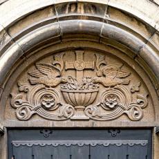 Die gotischen Merkmale sind: der plastische Bauschmuck der Fassade, die Ausbildung von vorgeblendeten Giebeln mit aufgesetzter Palmette bzw. Kreuzblumen über den Portalen und über der 6-teiligen Rosette.