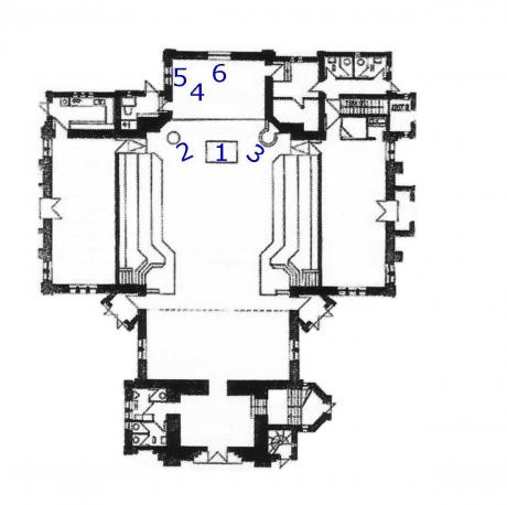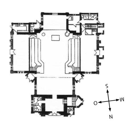 Die Kirche ist über einem kreuzförmigen Grundriss errichtet. Der Chorraum weist nach Süden.