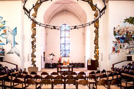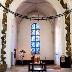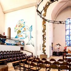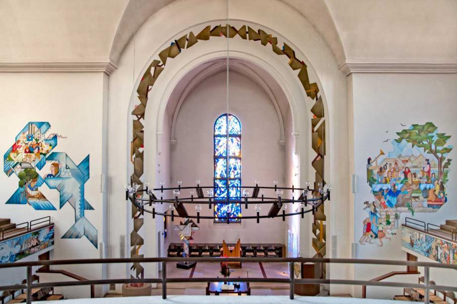Nach dem Wiederaufbau erhielt die Kirche im Jahre 1956 wieder einen künstlerischen Schwerpunkt: das acht Meter hohe Chorfenster des Stuttgarter Kunstmalers Christian Oehler (* 1909 Bad Cannstatt, + 1986 Netstal /Schweiz) Es ist das erste ungegenständlich konzipierte Betonglasfenster, das für einen kirchlichen Raum geschaffen wurde.