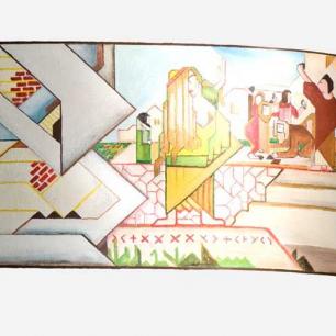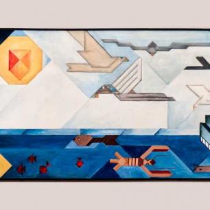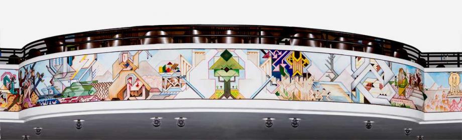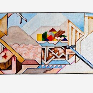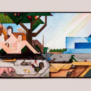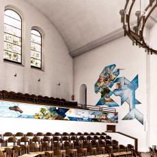 Die biblische Schöpfungsgeschichte wird exakt in Bildersprache übersetzt. Trennung von Licht und Finsternis, Himmel und Wasser, Meer und Land. Dann die Schaffung von Pflanzen, Sonne, Mond und Tieren und - ganz zuletzt - vom Menschen und am Ende - als »Krone der Schöpfung« - der Sabbath, das Ausruhen, die Freude Gottes an seinem Werk. Der Künstler hat in die Schöpfungsgeschichte bedrohte Tiere wie Marienkäfer, Elefanten und Libellen eingezeichnet und fordert damit zum gewissenhaften Umgang, zur »Ehrfurcht vor allem Lebendigen« auf.