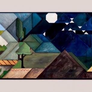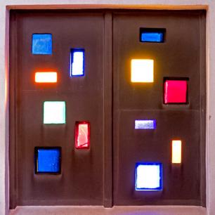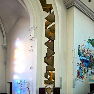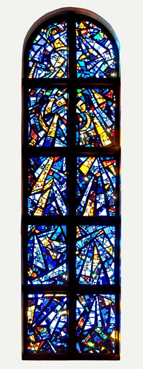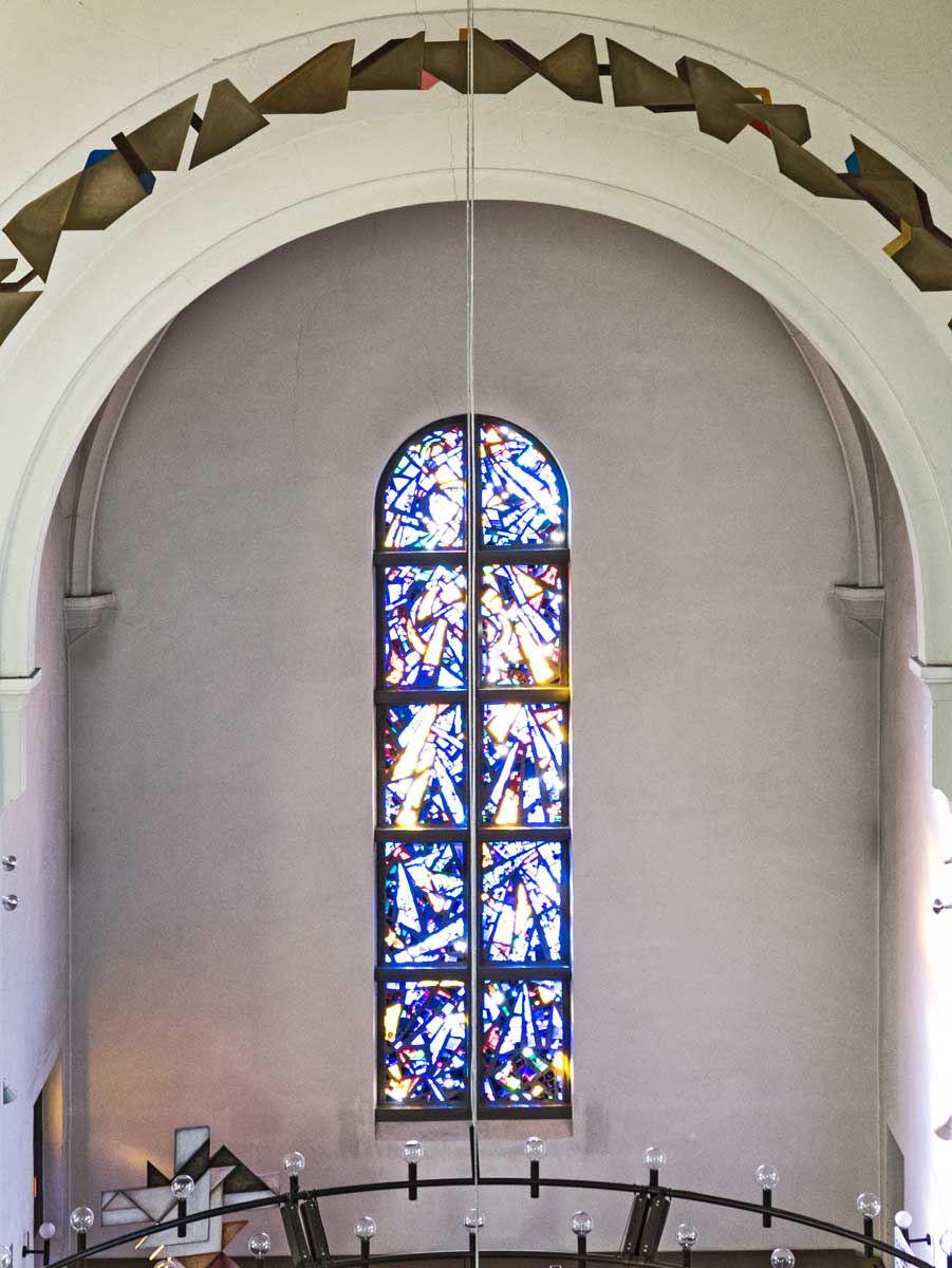 Thema des Fensterbildes ist Pfingsten, das mit expressionistischer Wucht entfaltet wird: eine bizarre Farbexplosion, Glas in Beton. Kantig. Monumental. Reiner Rhythmus der Freude. Viel Blau. Violett. Und etwas Gelb. Wie Strahlen. Ein Blitz. Wenig Rot. Die Gläser massig, eckig, scharf ausgeführt. Ein Hoffnungs-Bild: Licht leuchtet in die Welt hinein, die - wider allem Augenschein - nicht sich selbst überlassen ist.