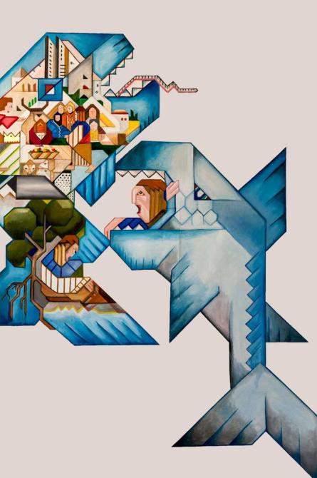 Der Künstler hat die zentralen Motive der Jonageschichte in den berühmten Wal eingezeichnet, in dem Jona drei Tage und drei Nächte verbringen muss, weil er sich dem Auftrag Gottes, der bösen Stadt Ninive das Strafgericht anzusagen, entziehen will.
