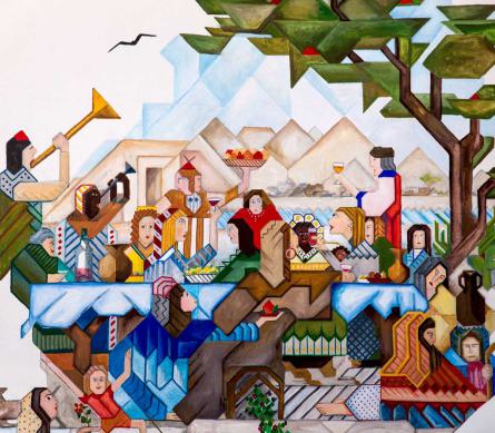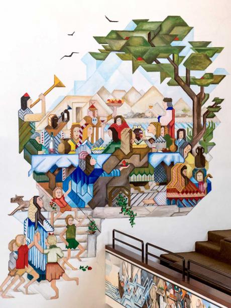 Dem Fries liegt die biblische Verheißung (Jes 11; Mt 8,11) zugrunde, dass am Ende der Tage aus allen Himmelsrichtungen die Menschen zusammenkommen, um gemeinsam am Tisch Gottes zu essen und zu trinken und friedvoll festlich - feiernd zusammen zu sein. Eine versöhnte Welt von Jung und Alt, Schwarz und Weiß, von Mensch und Tier ist auf dem Fries zu sehen. Alles Trennende, aller Streit ist überwunden. Der Künstler verlagert die Verheißung übrigens in die Gegenwart: Zuffenhäuser Bürger hat er in das Bild »eingemalt«.