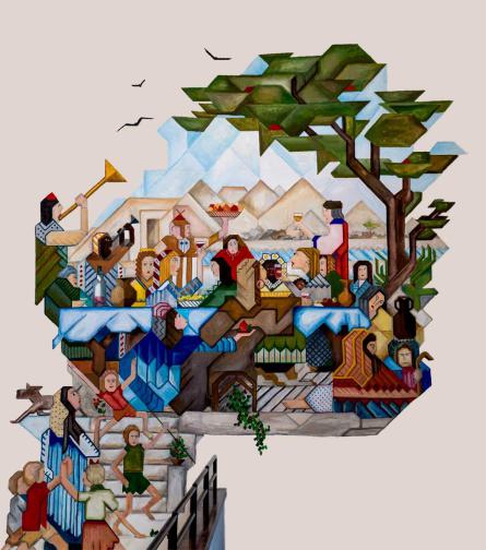 Mit Kain und Abel begann die Geschichte der Gewalt und des Terrors, die bis in die Gegenwart eine grausame Fortsetzung findet. Ganz aussen ist Jesus zu sehen: Er, der Frieden, Gerechtigkeit und Barmherzigkeit gelehrt und gelebt hat (Matthäus 5), wird aus der Welt regelrecht herausgedrängt.