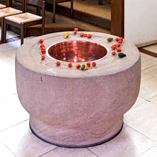 Den Rahmen bilden Wassergeschichten: rechts die Taufe Jesu durch Johannes, links außen die Sturmstillung Jesu. Die zahlreichen Bilder dazwischen zeigen das neue Leben, das Jesus bringt: »Blinde sehen und Lahme gehen, Aussätzige werden rein und Taube hören, Tote stehen auf und Armen wird das Evangelium gepredigt« (Matthäus 11,5).