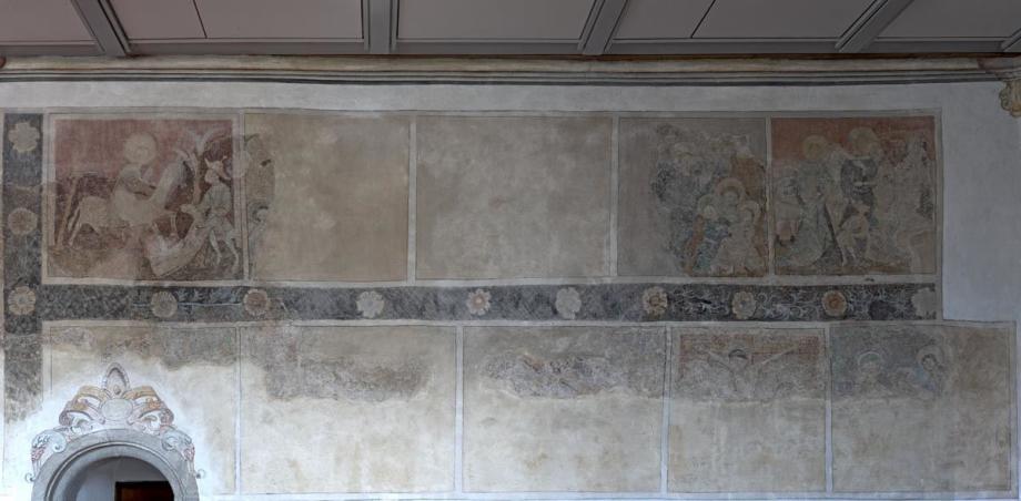 Die Wandmalereien mit der Passion Christi stammen aus dem 15. Jahrhundert, es handelt sich um Malereien auf Kalksandputz. Bei der Sanierung im Jahr 1964 wurde die Nordwand des Kirchenschiffes für eine Erweiterung entfernt und die dort aufgefundenen Malereien mit dem Putzträger auf die Chornordwand appliziert. Die restliche Kirchenbemalung stammt von 1621. (Klick ins Bild vergrößert)