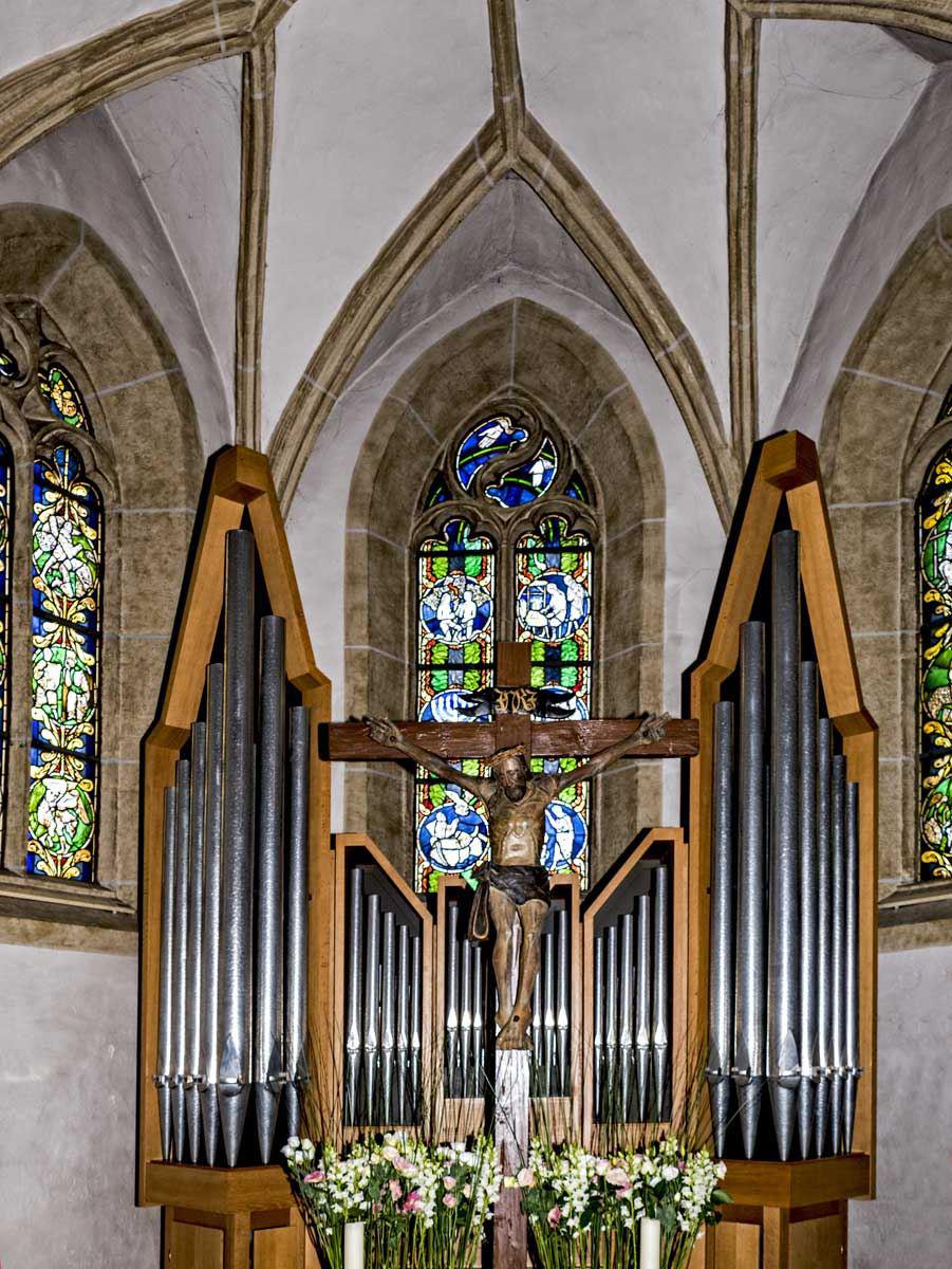 Dr. Supper hat die jetzige Orgel entworfen und das Prospekt so gestaltet, daß die drei Apsisfenster nun ganz zu sehen sind. Die nun freigelegten Chorfenster haben sich im besonderen für eine künstlerische Bearbeitung angeboten. Professor von Stockhausen gestaltete die drei Fenster. Die Ausführung lag in den Händen der Firma Saile aus Stuttgart.