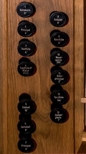 1. Gemshorn 8’ 2. Prinzipal 4’ 3. Violflöte 4’ 4a Feldflöte 2’ 4b Mixtur 3-4fach 2’ . In dieser Mixtur ist die Feldflöte als Vorabzug enthalten, das heißt, wenn das Mixtur-Register halb gezogen wird, dann ertönt nur die Feldflöte 2'. |