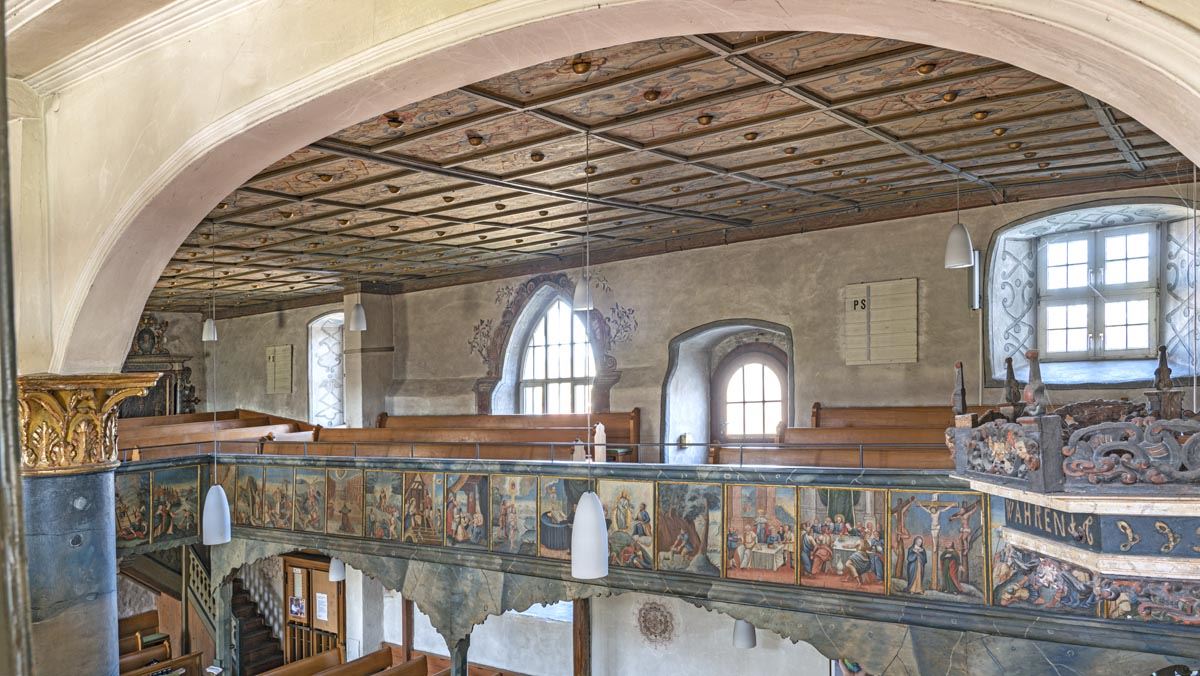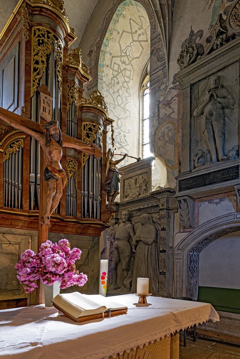 5.35 - 5.37 · Blick zur Westempore, Auferstehungsbild darunter (Jörg Herzog 1596)