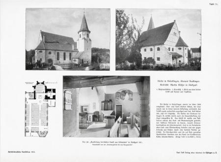 .Die Kirche in Holzelfingen wurde im Jahr 1909 umgebaut; Chor und Turm blieben stehen, der Chor wurde nur in seiner inneren Gestaltung verändert, das Schiff wurde wesentlich vergrößert und hat, statt früher 300, jetzt 475 Sitzplätze. Die Kosten des Umbaues betrugen M. 50000, worin auch die Neuanschaffung der Orgel inbegriffen ist. Das Schiff ist massiv aus Tuffsteinen erbaut, das Dach mit Pfannenziegeln gedeckt; das sichtbare Holzwerk im Inneren, sowohl Zimmerkonstruktion als Schreinerarbeit, sind in der Naturfarbe ohne Lack- oder Ölbehandlung belassen und nur gegen Schmutz und Reitzen durch eine farblose Tinktur geschützt. Die Wandge-mälde und die auf Holz gemalten Apostelbilder stammen von der Hand der Kunst-malerin Käthe Schaller-Härlin. (Vergl. Tafel 14 in Heft 1, 1912)