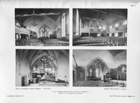 S.395ff: …“Vielleicht am selbständigsten erscheint trotz der Fischerschen Anregung M. Elsäßer. Schon in seiner ersten Ausführung, der Kirche in Lichtental bei Baden-Baden, in Dimensionierung und Ausgestaltung des Raumes von ihm charakteristisch verschieden, hat er seither die verschiedenartigsten Aufgaben mit demselben künstlerischen Feingefühl, nie versagender Gestaltungskraft und technischer Sicherheit gelöst (Kirche in Gaisburg, Holzelfingen, Mittelstadt, Bonlanden, Kirchheim u. T., Schwenningen u.a., (Abbildungen Seite 397, 398, 399, 400, 401). …