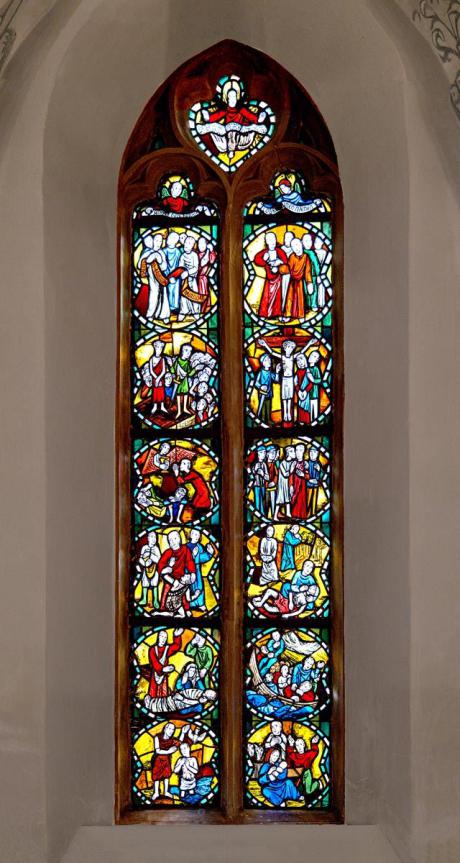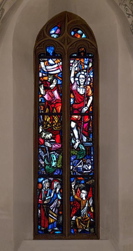 Das Fenster rechts der Mitte (1952/53) zeigt Geschichten des neuen Bundes von unten nach oben: