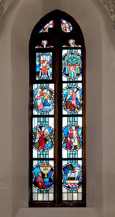 Das Nordfenster (1959) zeigt Bilder aus der letzten Schrift der Bibel, genannt Offenbarung des Herrn an seinen Jünger Johannes.