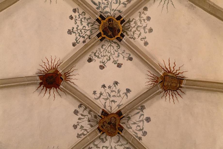 Die Schlusssteine des spätgotischen Chorgewölbes zeigen vorne (über dem Altar) den Ritter Georg mit einem Speer als Drachentöter, dann den Kirchenheiligen Blasius mit Bischofsmütze, Bischofsstab und Abtstab, dann Maria mit dem Jesuskind, das den Reichsapfel in der rechten Hand hält, endlich den erhöhten Christus mit einem Heiligenschein (Nimbus) über dem Dornenkranz.