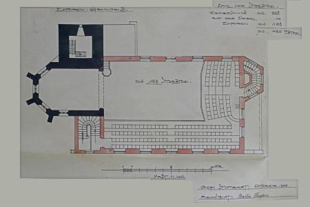 Anders als in den beiden obigen Grundrissen Elsaessers von 1908 wurde die Orgel nicht im Chor der Kirche aufgestellt. Daher entfielen die auf der Orgelempore eingezeichneten Sitzplätze.