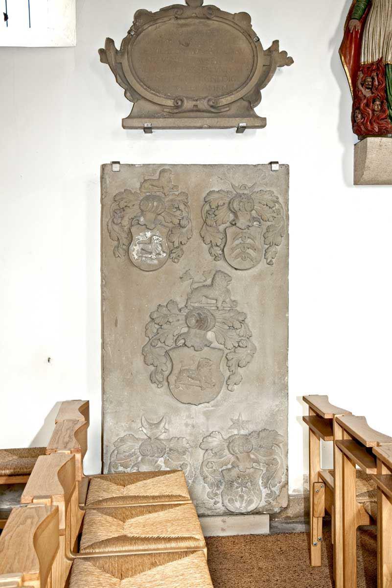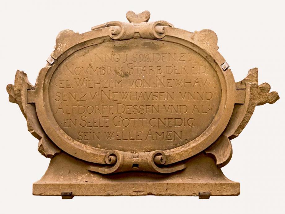 ANNO 1596 DEN 23. NOVEMBRIS STARB DER EDEL WILHELM VON NEWHAVSEN ZV NEWHAVSEN UNND ALFDORFF. DESSEN VND ALEN SEELE GOTT GNEDIG SEIN WELLE AMEN