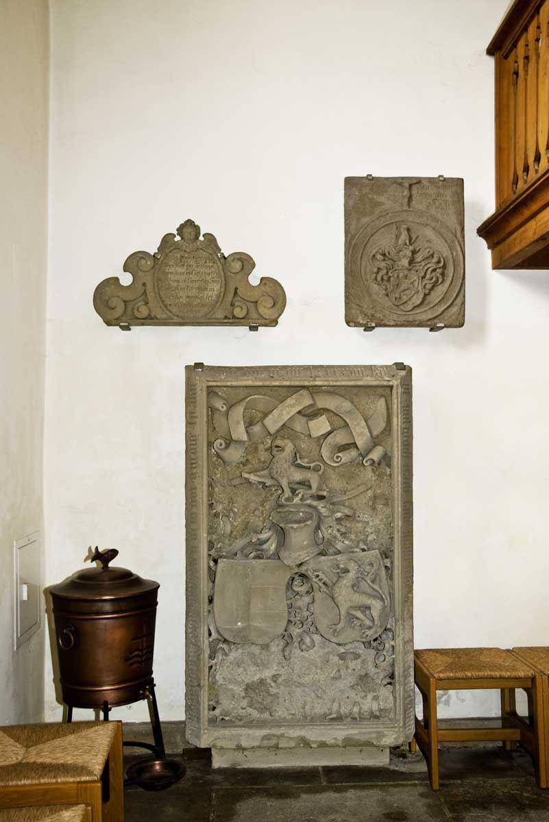 Westwand · unten: Grabplatte Friedrichs II. von Neuhausen 1494