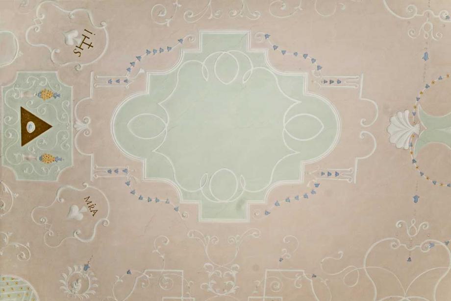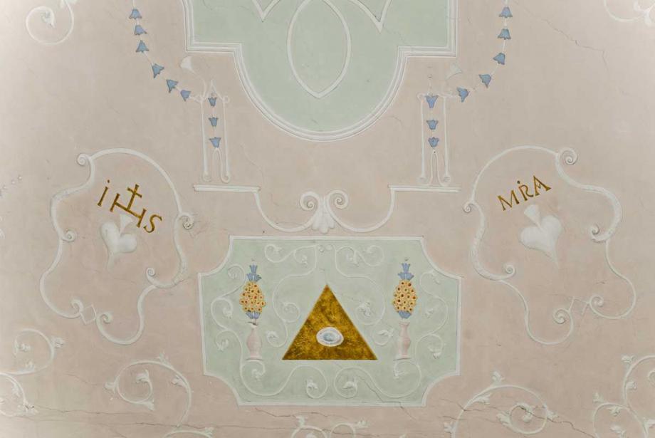 Stuckdecke (über dem Altar) mit Auge Gottes, Monogrammen (Jesus & Maria)