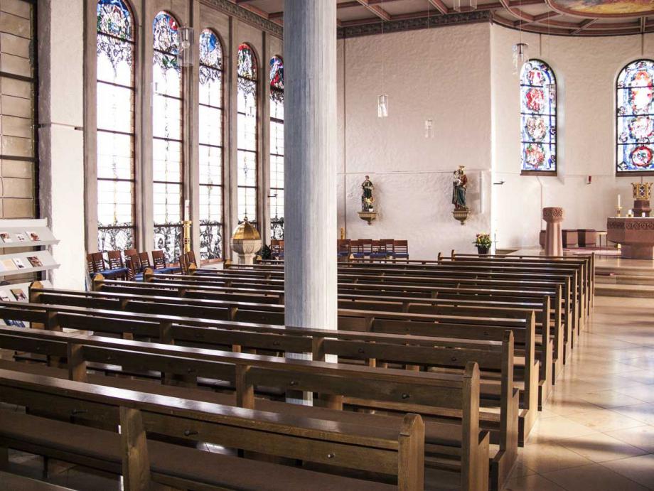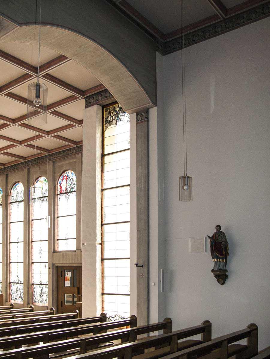 Die seitlichen Fenster in Nord (NT) und Süd (AT) sind nicht wie die Apsisfenster in leuchtendem Rot, sondern vorwiegend in Atmosphäre schaffendem Gelb gehalten. Die dargestellten Bilder sind Einladungen an die Betrachter, die Kirche als Ort der Begegnung zwischen Gott und Mensch zu sehen. Für diese Begegnung gibt Gott sein geschriebenes Wort in den Texten des Alten und des Neuen Testamentes. Sein Leben schenkt er in den heiligen Sakramenten. In den Seitenfenstern der Kirche sind diese Inhalte in alt- und neutestamentlichen Darstellungen zu sehen.