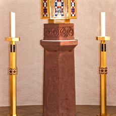 Vorgabe für den Altar war: Ein Kelch aus rotem Buntsandstein, mit Ähren verziert, der aus dem Muschelkalk entsteht. „Wenn das Weizenkorn in die Erde fällt trägt es reiche Frucht.“ Ähnlich sind auch Ambo und Tabernakelstele bearbeitet, hinzu kamen die Sedilien, die Sitzplätze für Pfarrer und Ministranten. Die Materialwahl symbolisiert unsere heimatliche Erdgeschichte, (Buntsandstein und Muschelkalk).