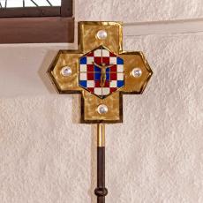 Tabernakel, Verzierung mit Cherubim (Kerubim) = Wächter in der Nähe Gottes, Vortragekreuz, Kerzenständer (auch für Osterkerze), Weihwasserbehälter alle mit Emailstücken angepasst an die Farbgestaltung der Kirche (Fries und Ornamente).