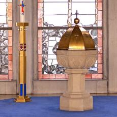 Ausstattung Chor · Taufstein · Kerzenständer