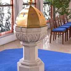 Der alte Taufstein, aus gelbem Sandstein, wurde aus der früheren Kirche übernommen