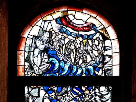 Im ersten Bild auf der Straßenseite wird der Durchzug Israels durch das Rote Meer dargestellt (Ex 14, 5-31). In der Osternacht bekennen die Gläubigen: „Dies ist die Macht, die die Söhne Israels aus Ägypten befreit und trockenen Fußes durch die Fluten des Roten Meeres geführt hat." Es sind die Befreiung aus der Knechtschaft und die Absage an das Böse. Den glaubenden Menschen wird das göttliche Leben mit der Taufe geschenkt.