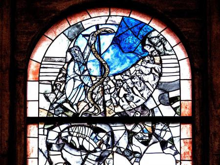 Gott will das Leben, nicht den Tod für den Menschen. Das linke Fenster zeigt Mose, der eine eherne Schlange erhöht. Die, die zu ihr aufschauten, wurden vom größten Übel, dem Tod, gerettet (Num 21, 4-9).