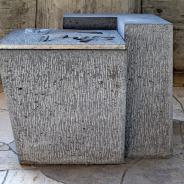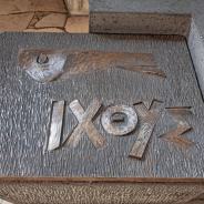 Oben auf unserem Taufbecken sind Buchstaben und ein Bild, das einen Fisch darstellen könnte. Der Fisch ist ein Zeichen für die Christen. Die einzelnen Buchstaben sind griechisch und jeweils die Anfangsbuch-staben des Glaubensbekenntnisses. Zusammengesetzt bedeuten sie „Fisch“ – daher das Zeichen.