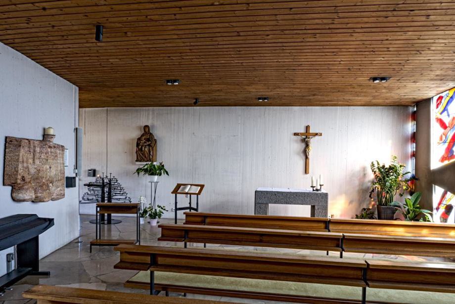 Der Altar, der Tabernakel, das Ambo und der Taufstein stammen von Alfred Tme aus Korb.