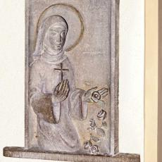 Der Bildhauer Wilhelm Müller (München) bezeichnete die von ihm 1975 geschaffene Keramikarbeit als den „Baum des Lebens". Die frischen Zweige und das grüne Blattwerk, die aus dem toten Holz des Kreuzes sprießen, weisen darauf hin, dass auf den Karfreitag die Auferstehung an Ostern folgt. Die in bescheidenem Habitus gehaltene Muttergottesfigur aus glasierter Terrakotta am linken Mauerpfosten des Chorportals - vermittelnd an der Nahtstelle zwischen Gemeinde und „Christussphäre" postiert – ist ebenfalls eine Arbeit von Wilhelm Müller.