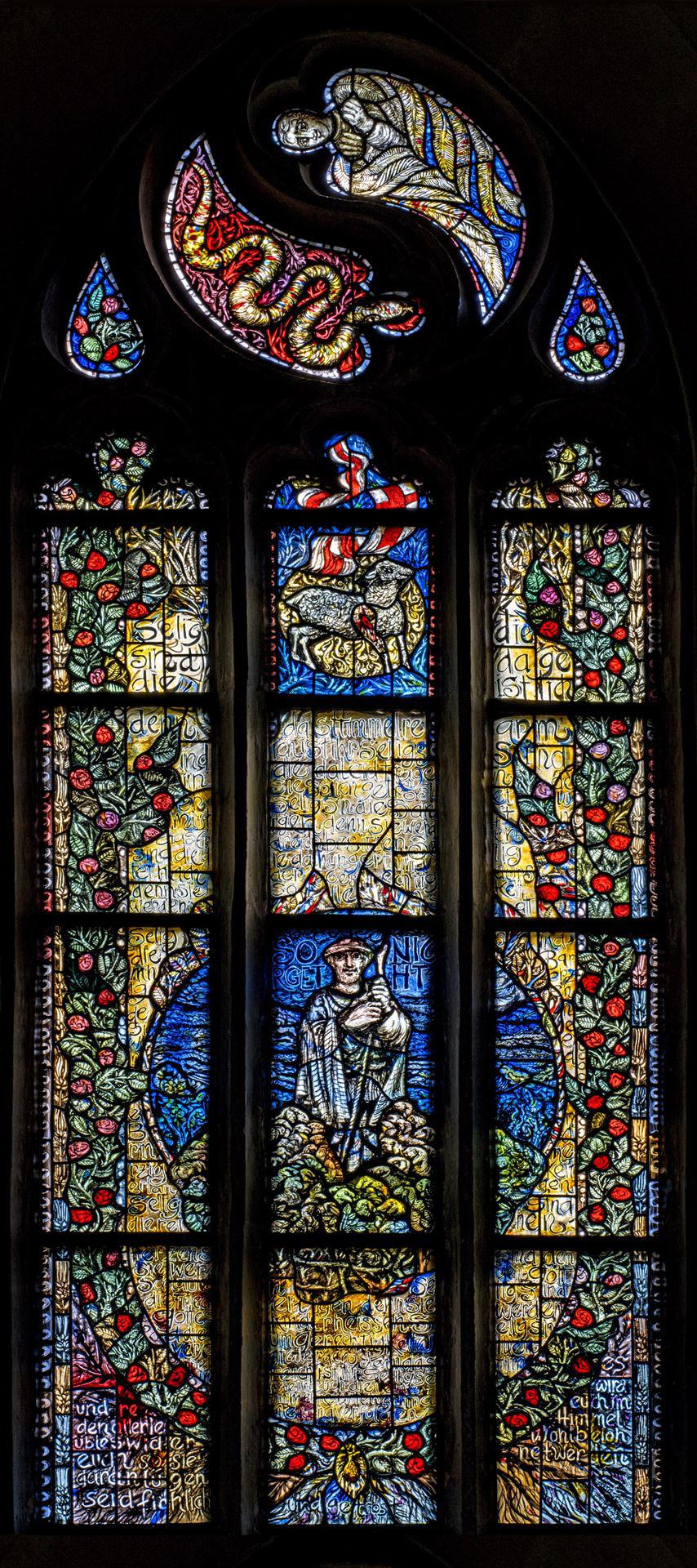 Aus einem Samenkorn entspringen Zweige mit blühenden Rosen, die von unten bis oben die Bilder mit biblischen Motiven umranken. Beherrschend in der Mitte steht ein rundes Medaillon mit dem guten Hirten, der seine Herde behütet. „Sorget nicht!", ruft das Medaillon mit seiner Inschrift dem Betrachter zu und nimmt damit einen zentralen Abschnitt der Bergpredigt auf: Umschrieben im wörtlichen Sinne ist dieses Medaillon mit den Seligpreisungen, mit dunklen Lettern auf einem leuchtend gelben Grund geschrieben.