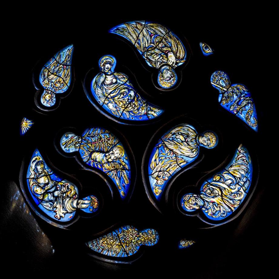 In den fischblasenartigen Verzierungen im gotischen Maßwerk dieses Rundfensters finden sich Szenen aus der Geburtsgeschichte nach Lukas 2, Matthäus 1 und der Offenbarung 12