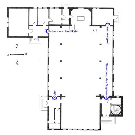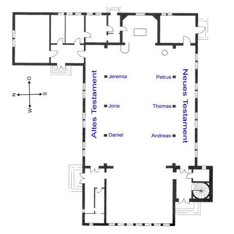 Neu: Küche nördl. des Gemeindesaals; WCs östl. des Wendelsteins |