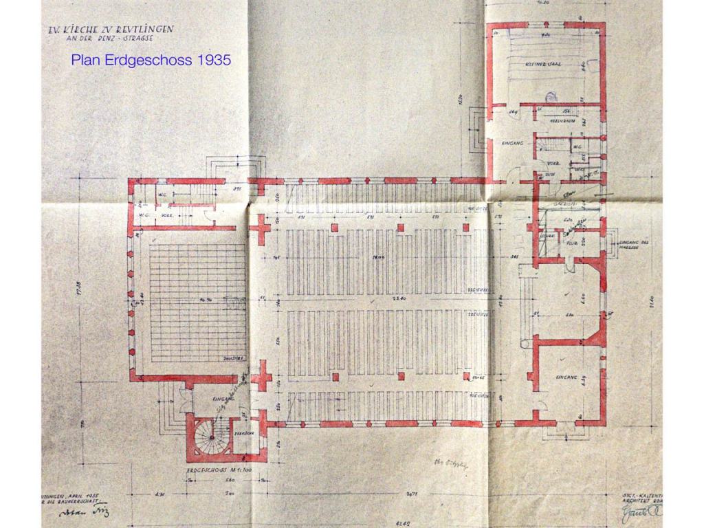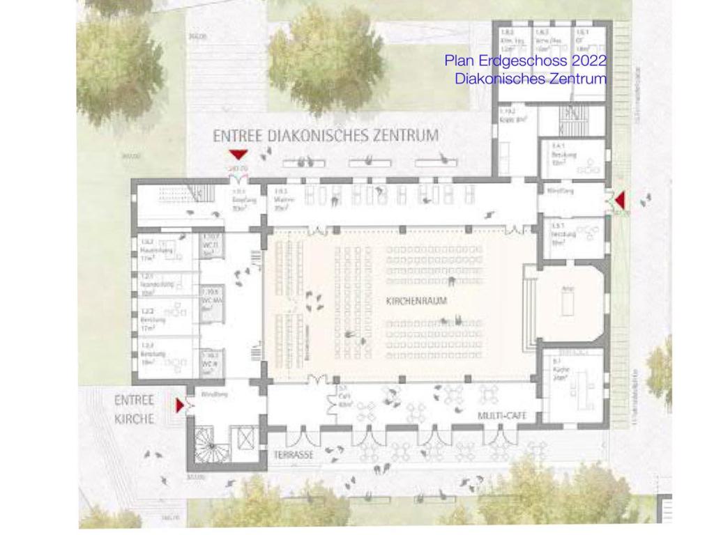 Der Vergleich Bauantrags-Grundriss von Hannes Mayer 1935 - Wettbewerbsplanung 2022 zeigt die gewaltigen Veränderungen, die für die Kirche vorgesehen sind. U.a. Wegfall des großen Gemeindesaals, Umnutzung beider Seitenschiffe, wobei es im Süden ein Café geben wird mit neuen Fenstertüren ins Grüne hinaus und Küche in der bisherigen Kapelle. Der vorrangige Eingang ins Diakonische Zentrum führt dann durch die jetzige Sakristei; das nördliche Seitenschiff wird Wartebereich; zahlreiche Büros kommen in den Seitentrakt, den Gemeindesaal sowie auf die Empore, welche dann auch die Orgel verliert.