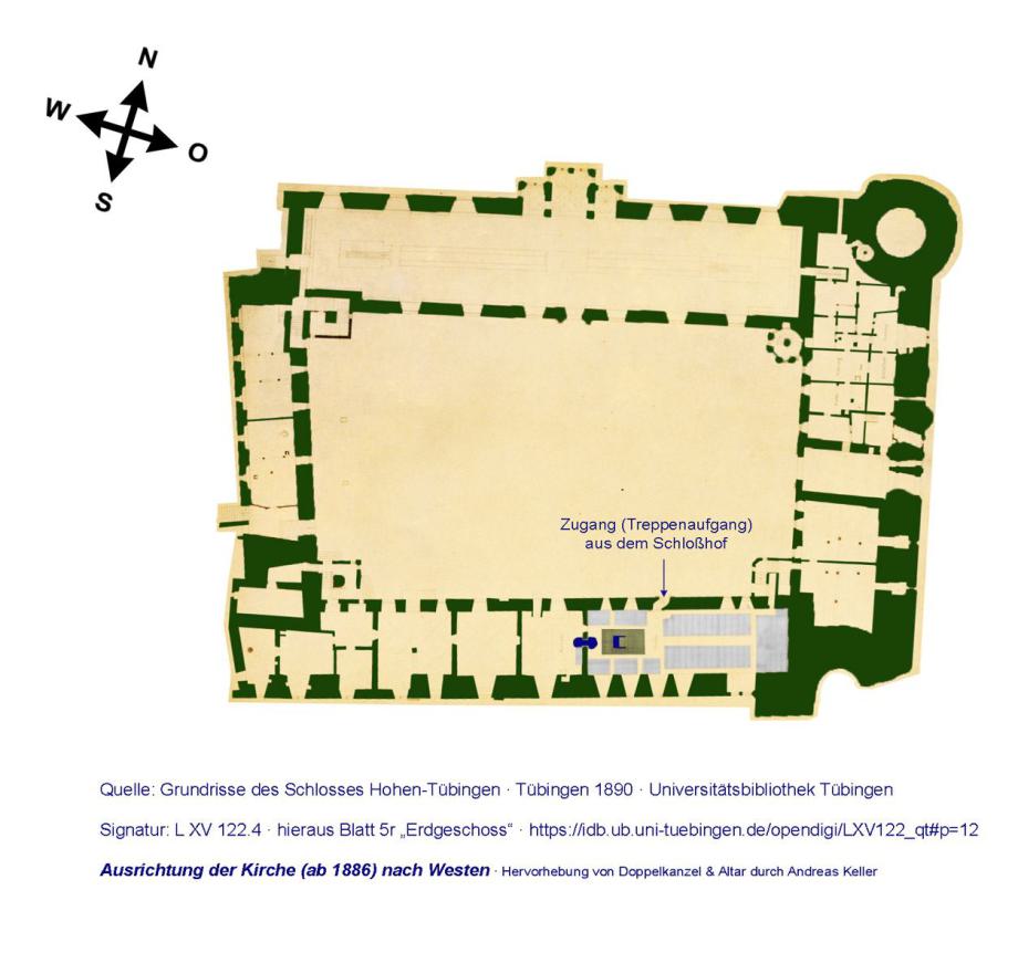 Ulrich Zimmermann fand in den Akten der Universität Tübingen Grundrisse, die belegen, dass die Schlosskirche ursprünglich geostet war, Dadurch war ein Direktzugang des Herzogs zur Kirche gegeben. 1886 wurde nach Plänen von Oberbaurat Leins auf Bauantrag vom 01.12.1885 (in den Akten) die Kirche um 180° gespiegelt, nach Westen gerichtet und dort das ehemalige Chemische Laboratorium als Sakristei mit Übungskanzel hinzugewonnen. Leider hat das Amt Tübingen der Landesverwaltung "Vermögen und Bau Baden-Württemberg" Abteilung 2: Liegenschaften eine Übernahme dieser Pläne auf die Website nicht gestattet (im Buch von Zimmermann sind sie mit behördlicher Genehmigung abgedruckt). Daher hier auf der Basis eines Grundrisses aus dem Jahr 1890 (mit erfolgter West-Ausrichtung) - veröffentlicht im Internet von der Universitätsbibliothek Tübingen mit "Public Domain"-Rechten [!] - 3 Bild-Montagen: