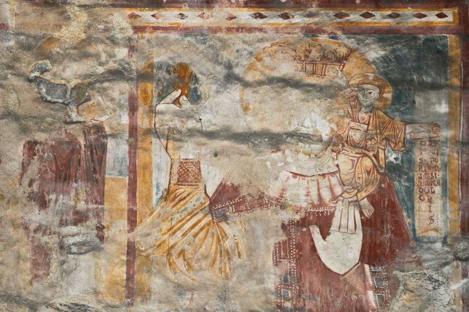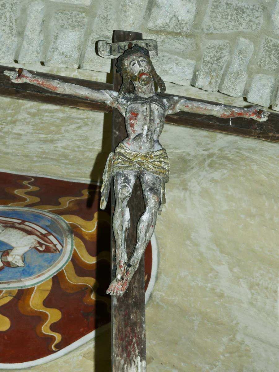 Das archaisch anmutende Kirchenschiff ist ein rechteckiger Saal, an dessen unverputzten Wänden noch Reste von Fresken zu erkennen sind. Der Boden ist mit unregelmässig verlegten Granitplatten verlegt. Auffallend sind die Anordnung von Chor und Krypta: Man kann vom Kirchenschiff aus in den Chor und die Krypta gleichzeitig sehen.