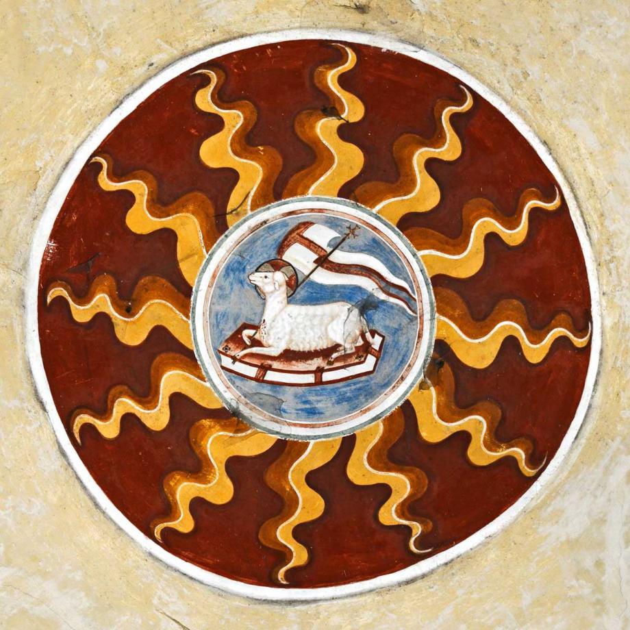 Christus in der Mandorla ist umgeben von den vier Evangelistensymbolen. Über dem Mittelfenster der Apsis ist die Heilige Dreifaltigkeit dargestellt als Trivultus: ein Gesicht mit vier Augen, drei Nasen und drei Mündern. Diese Art der Darstellung wurde 1628 durch ein päpstliches Edikt verboten. Da San Nicola nie Pfarrkirche war, wurde die Darstellung nie übermalt.