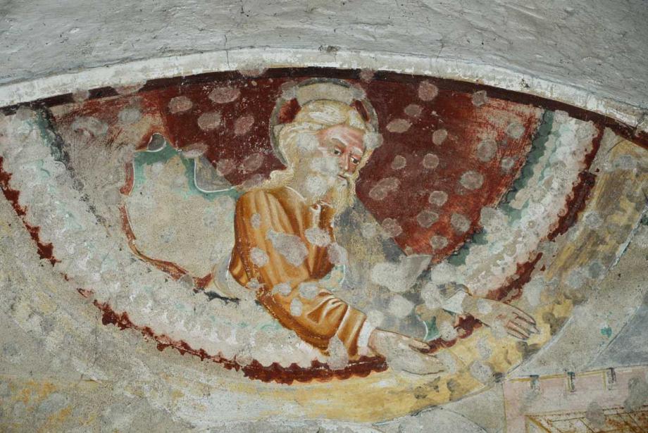 In der Gewölbedecke der Apsis haben sich spätgotische Wandmalereien von Nicolao da Seregno erhalten. Onkel und Neffe Seregno malten zwischen 1448 und 1480 nahezu in einer Monopolstellung zahlreiche Kirchen der Alpensüdtäler aus. Die Inschrift in winzigen gotischen Buchstaben oberhalb des Fensters gibt die Jahreszahl 1478 an und nennt den Maler: nicola seregnio de lug. pinsit. Die Namen der Auftraggeber stehen in einer weiteren Inschrift unterhalb des Fensters.
